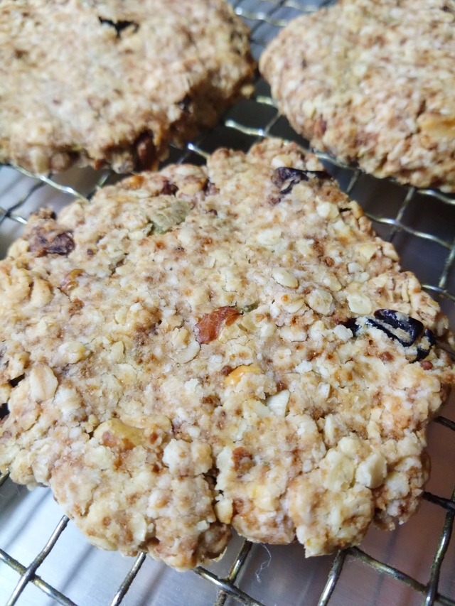 【原材料】(グルテンフリー) 有機オートミール/米粉/洗双糖/国産菜種油/有機ココナッツオイル/有機豆乳/有機くるみ/有機かぼちゃの種/有機白ごま/塩 1枚のサイズは直径10cm弱でボリュームがあります ザクザクボリボリ・・癖になるクッキーです